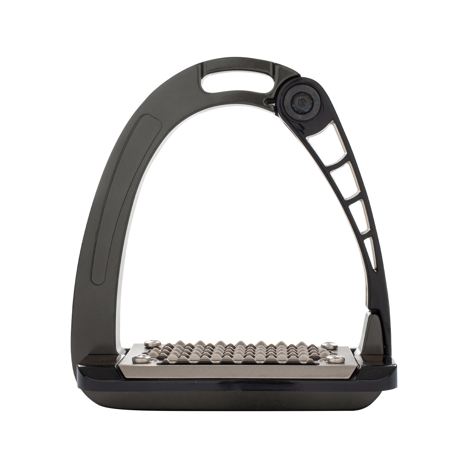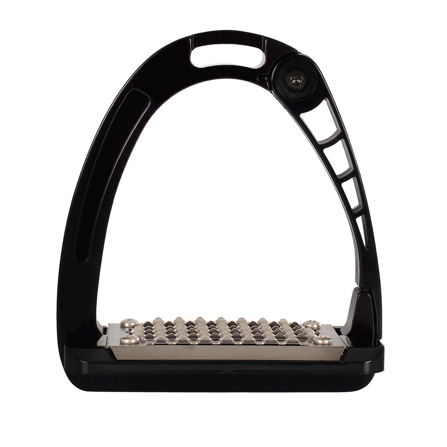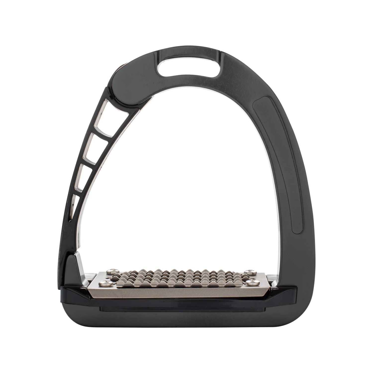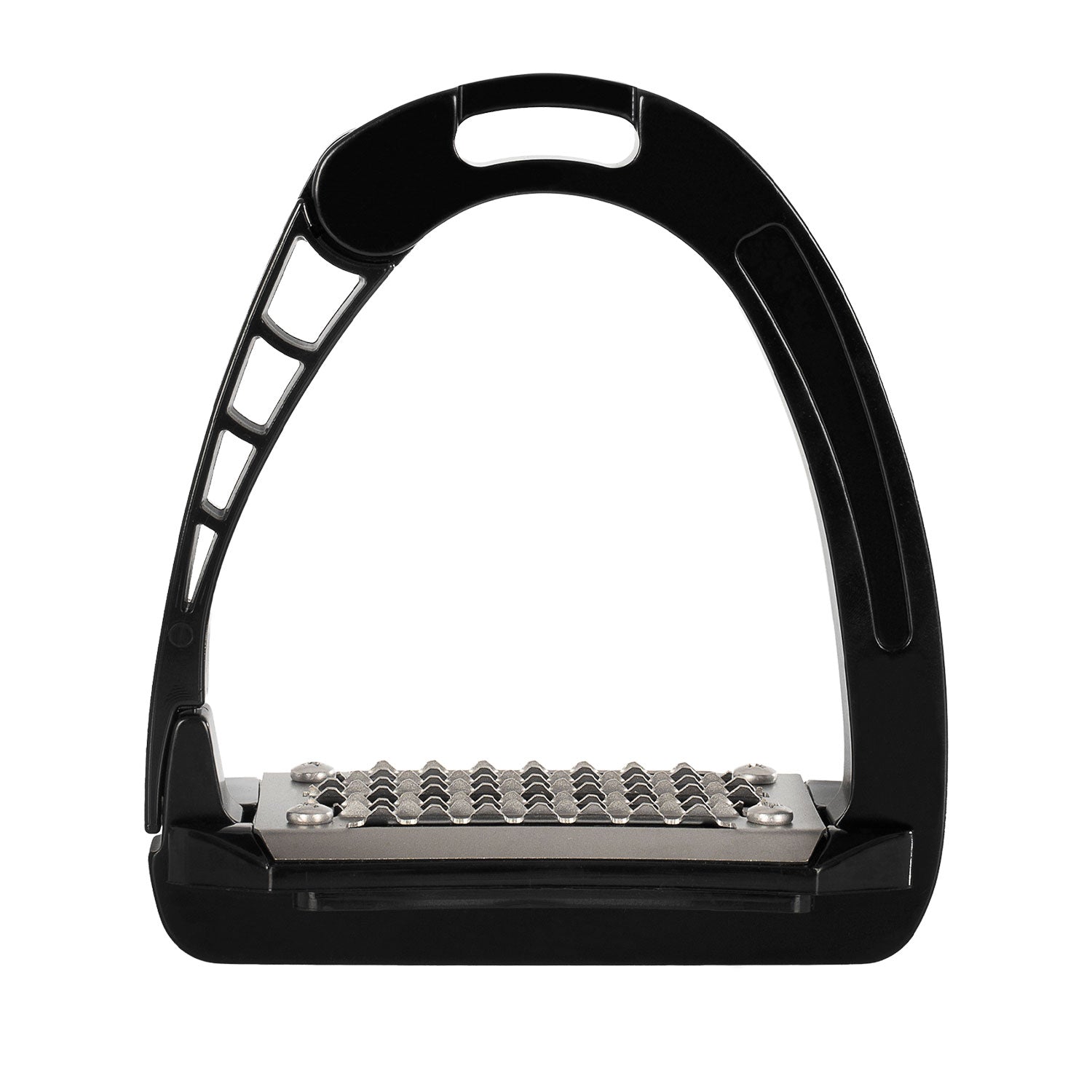 The patented side opening was created using an innovative injection molding technique. The outward opening of the stirrup arm aids in the release of the foot in case of emergency.
