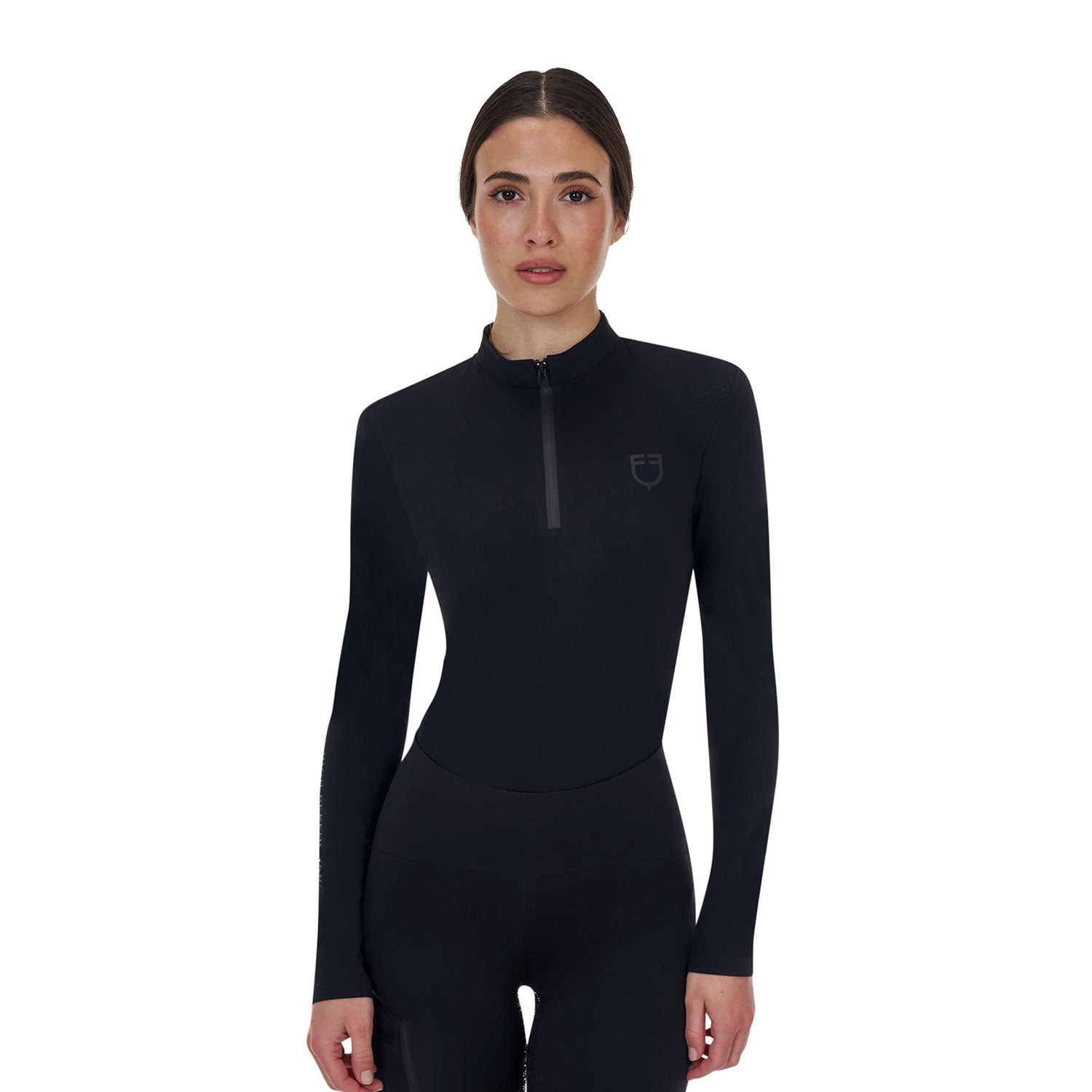 Women's slim fit long-sleeved training polo shirt in breathable technical fabric with heat-sealed seams, the key point of the Equestro Ridertechnology collection.
